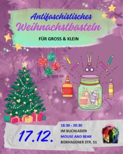 Wir wollen mit euch antifaschistischen Weihnachtsschmuck basteln! Was ist antifaschistischer Weihnachtsschmuck?Das ist eine Überraschung! Wann? am 17.12. von 18:30 Uhr bis 20:30 Uhr Wo? Im Buchladen „,Mouse and Bear“ in der Boxhagener Straße 51. Was brauchst du? Nichts. Aber du kannst dir einen Trinkbecher für ein warmes Getränk mitbringen 🙂 Wer darf mitmachen? Alle, die…